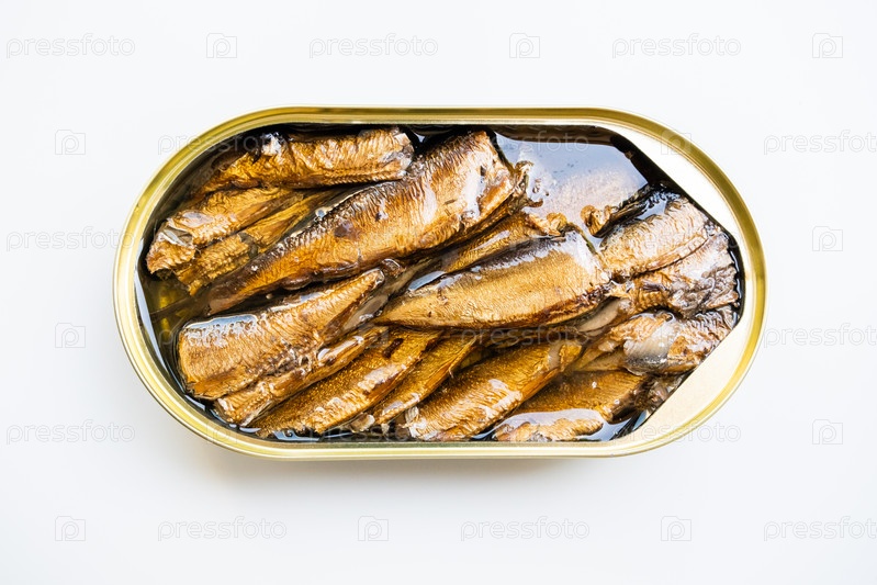 Шпроты с маслом в открытой жестяной банке на белом фоне, крупным планом