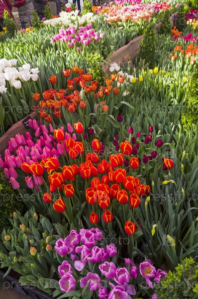 Яркие разноцветные тюльпаны. Традичионная ежегодная выставка "Репетиция весны" в в Аптекарском Огороде (филиал ботанического сада МГУ). Москва