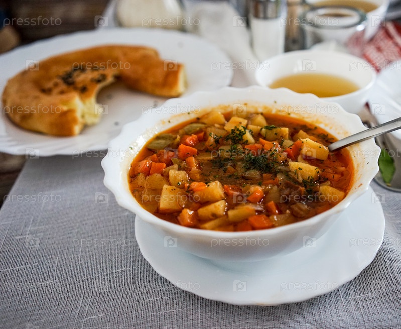 Лагман в белой тарелке на фоне белой скатерти, татарская кухня