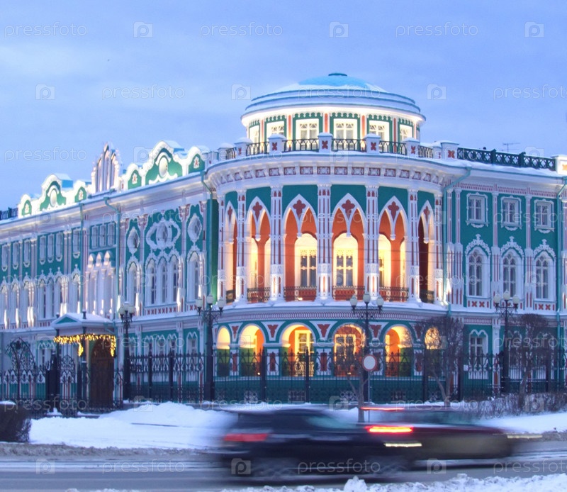 Фасад дома Севастьянова — историческое здание в стиле неоготики, самое известное архитектурное сооружение в историческом центре Екатеринбурга. Зимний вечер. Размытый фокус