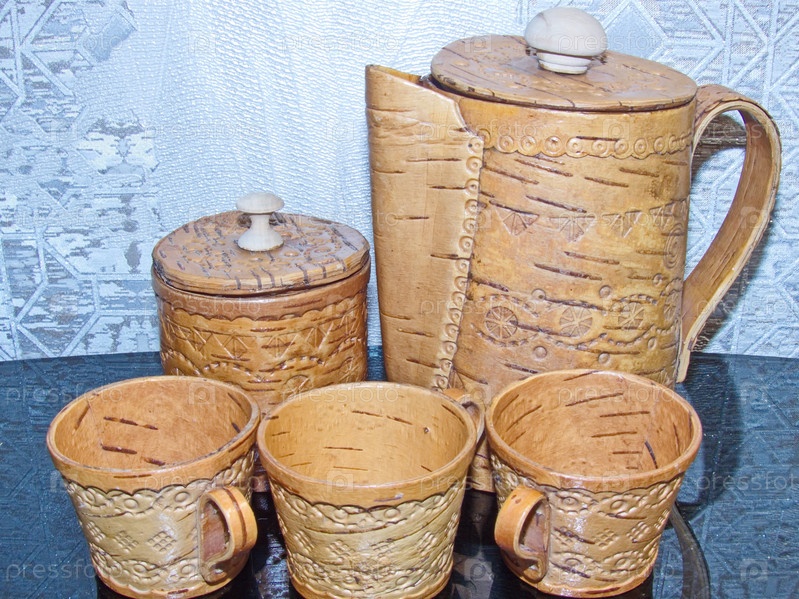 Чашки, сахарница, чайник из бересты. Кухонные принадлежности. Народные промыслы России. Ретро. Изделия из бересты изготавливались большинством обществ задолго до того, как была изобретена керамика