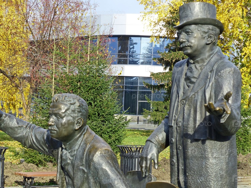Памятник братьям Люмьер. Рядом с фигурами братьев и их изобретением - кинокамерой, поставлен пустой стул для тех, кто хочет сфотографироваться. Екатеринбург, Россия, 18/10/2022