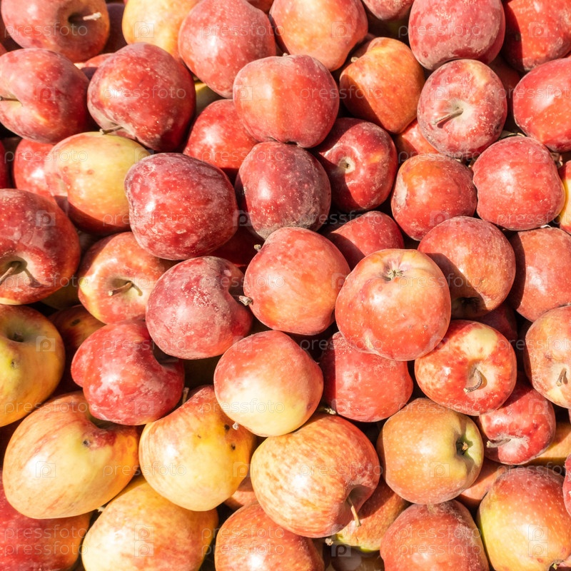 Спелые органические красные яблоки на фермерском рынке. Яблочный фон крупным планом. Здоровая веганская еда
