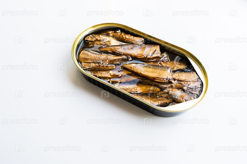 Шпроты с маслом в открытой жестяной банке на белом фоне