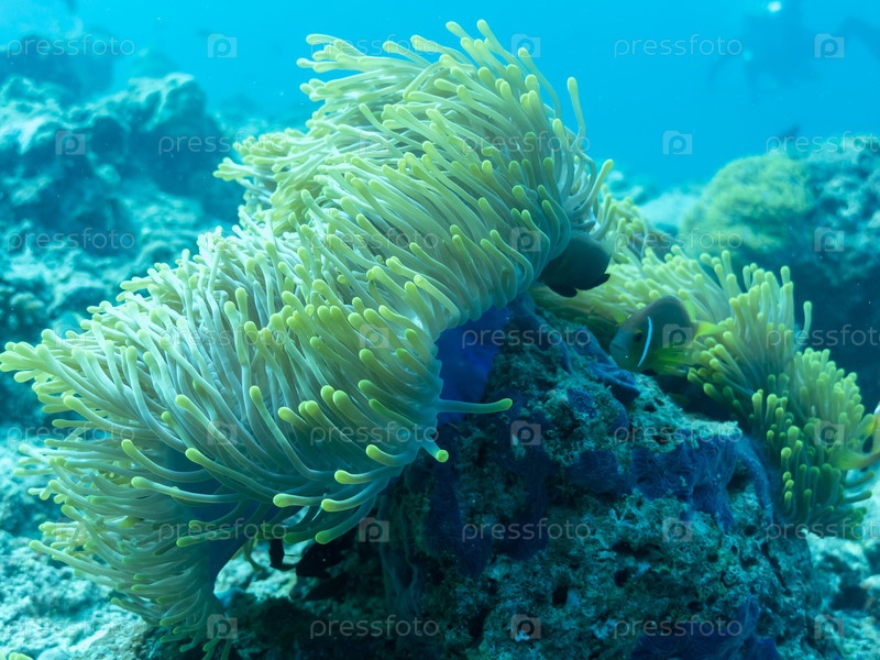 Рыба-клоун в актинии в глубинах Индийского океана, Мальдивы