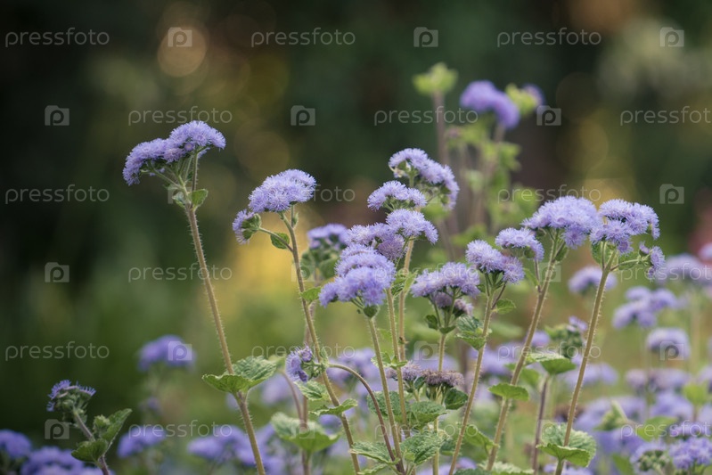 Пушистые сиреневые цветы на размытом темно-зеленом фоне