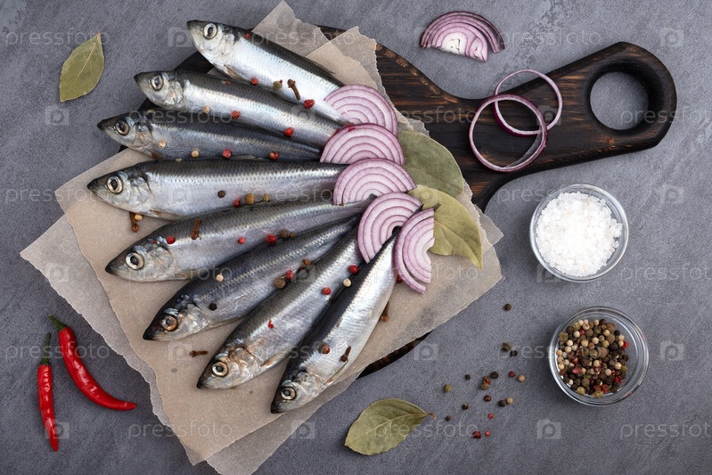 Несколько маринованных сельдей со специями на пергаментной бумаге