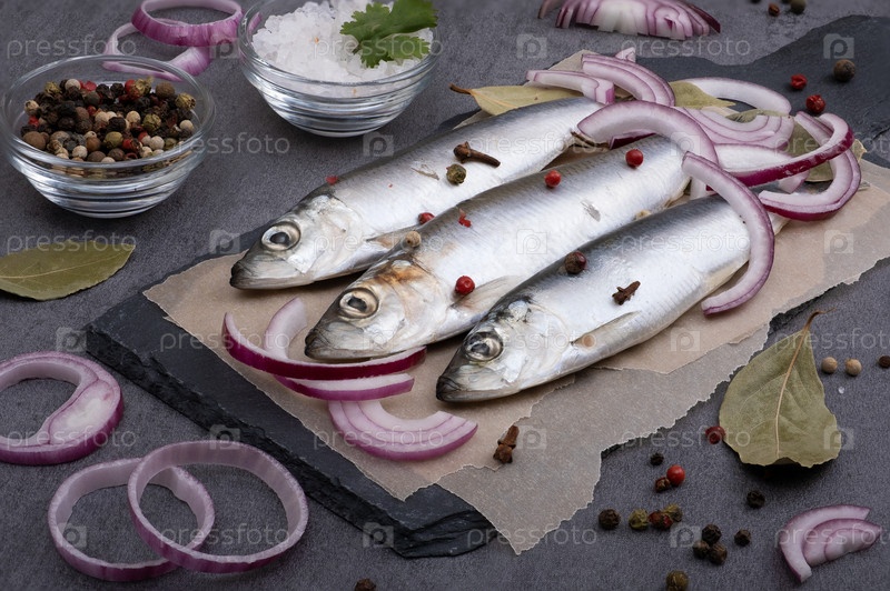Несколько маринованных сельдей со специями на пергаментной бумаге