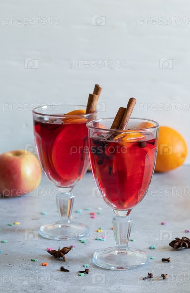 Два стакана глинтвейна, специи, фрукты, маленькие снежинки на светлом фоне