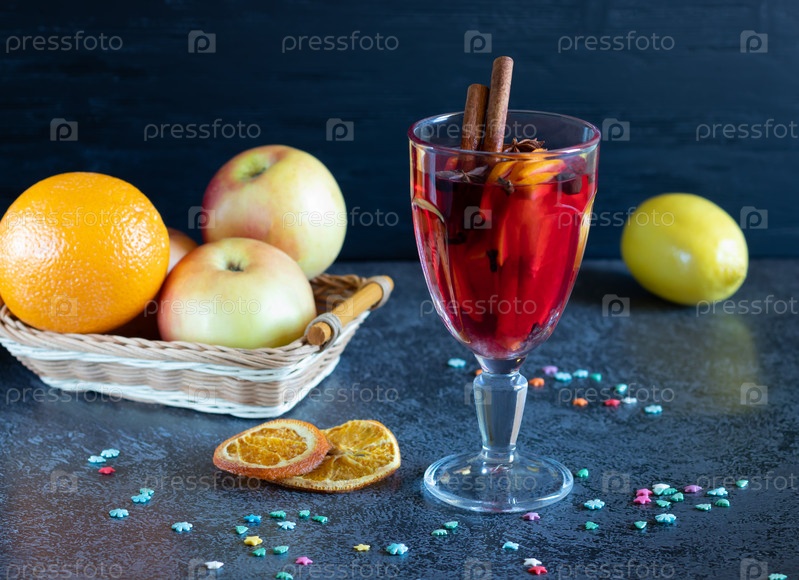 Стакан глинтвейна, фрукты, сушеные апельсины, маленькие снежинки на темном фоне