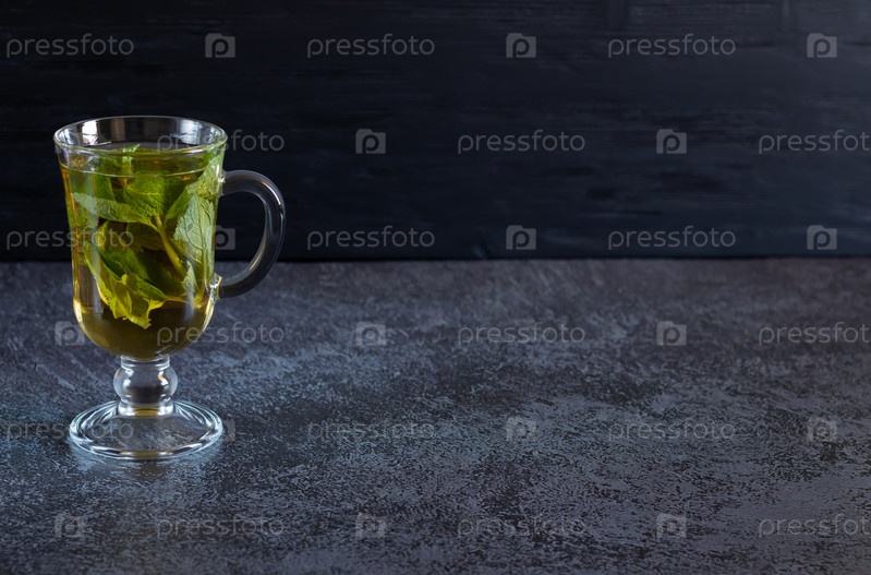 Горячий зеленый чай с мятой в прозрачном стакане с ручкой для холодных дней на темном фоне. С копией пространства справа, по горизонтали