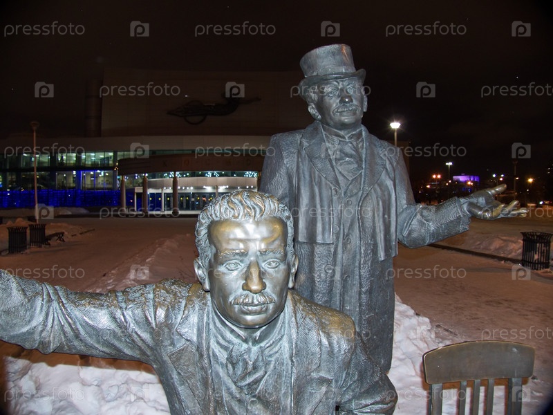 Памятник братьям Люмьер. Зимний вечер. Рядом с фигурами братьев и их изобретением - кинокамерой, поставлен пустой стул для тех, кто хочет сфотографироваться. Екатеринбург, Россия, 20/11/2022