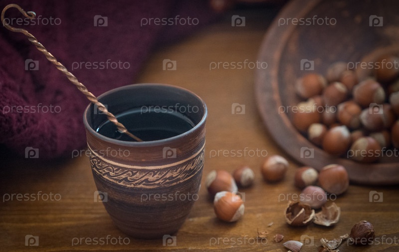 Темный фон с горячим напитком в керамической чашке
