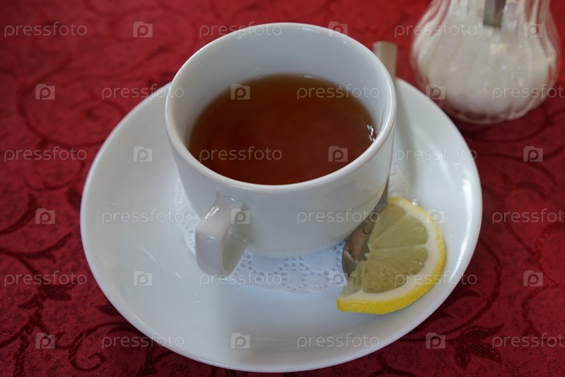 Белая кружка с чаем на столе с красной