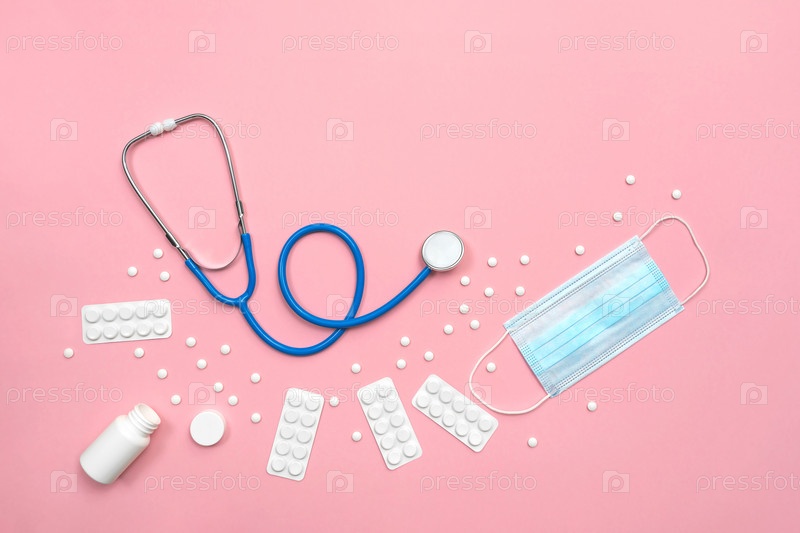 Синяя маска, белые таблетки и стетоскоп на розовом фоне. Медицинский фон для дизайна