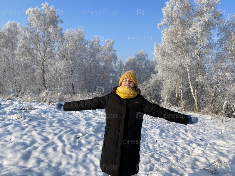 Счастливая девочка-подросток гуляет по заснеженному зимнему лесу