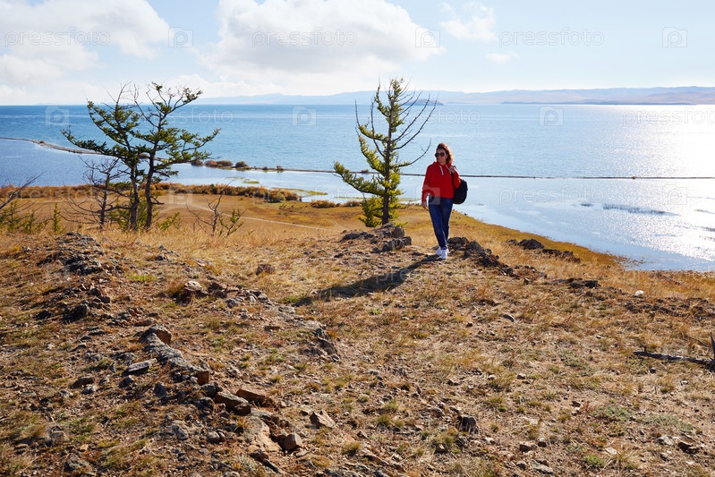 Женщина с рюкзаком путешествует по озеру Байкал ранней осенью в солнечный день