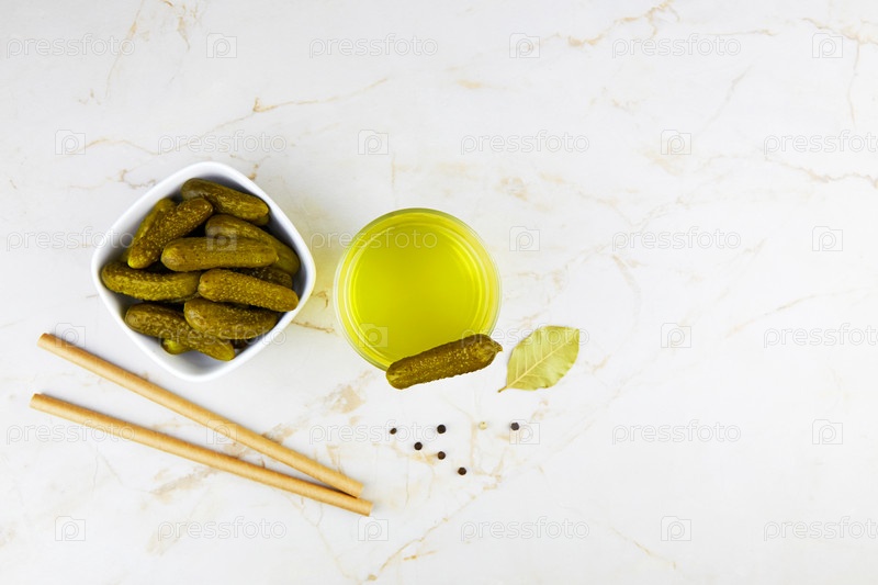 Маринованные огурцы в миске и рассол в стакане на светлом фоне. Здоровый энергетический напиток для спортсменов