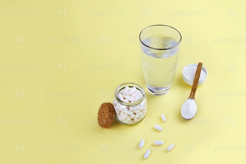Коллагеновый протеиновый порошок и таблетки в банках, стакан воды