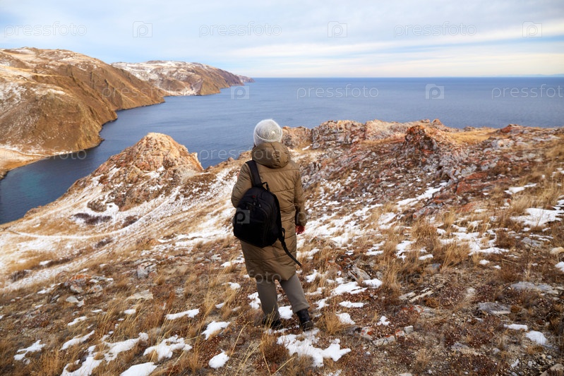 Путешествует женщина в теплой одежде с рюкзаком