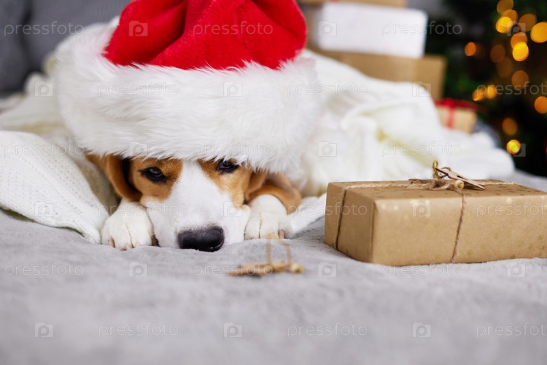 Собака-бигль в шапке Санта-Клауса лежит на кровати и спит