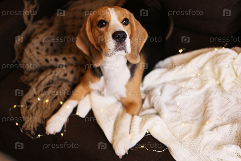 Милый бигль собаки лежит на софе