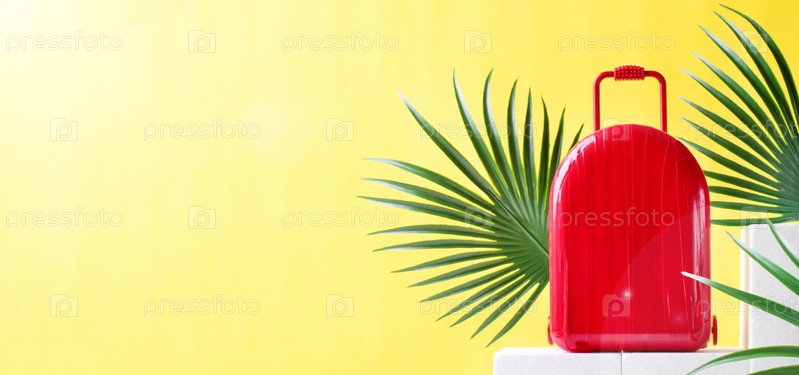 Веб-баннер с красным чемоданом и пальмовыми листьями на желтом фоне. Концепция путешествий и летних каникул. Макет с копией пространства