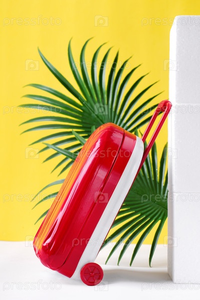 Красный чемодан, опирающийся на белую стену на желтом фоне с пальмовыми листьями. Концепция путешествий и летних каникул