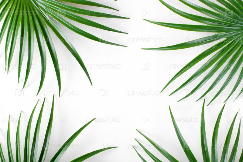 Макет с зелеными пальмовыми листьями на белом фоне с копией пространства. Минимальная плоская планировка