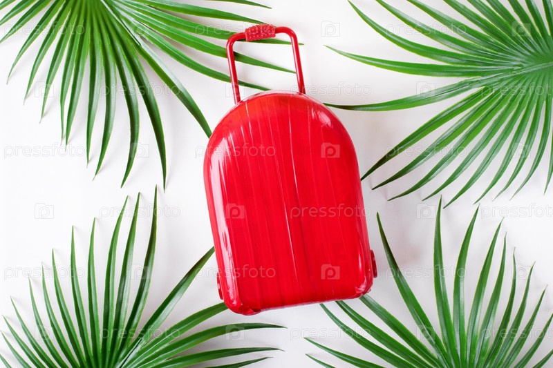 Квартира лежала с красным чемоданом и пальмовыми листьями на белом фоне. Концепция путешествий и летних каникул. Макет с местом для копирования на багаже