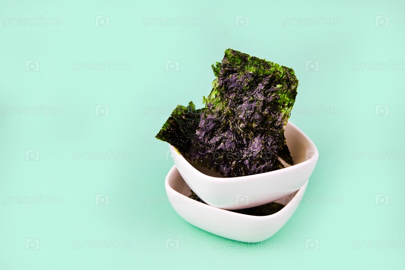 Хрустящие водоросли нори на тарелках. Традиционные японские листы из сухих водорослей