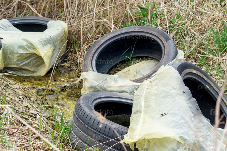 Автомобильные шины в лесу. Мусор на траве. Промышленное загрязнение окружающей среды