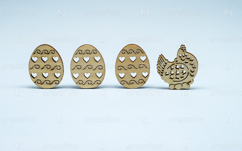 Пасхальный декор на светлом фоне. Деревянные фигурки яиц и курицы на Пасху