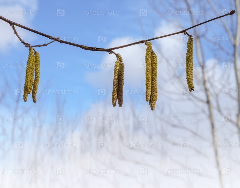 Весенняя сережка на фоне голубого неба. Деревья в цвету весной. Серьги на дереве
