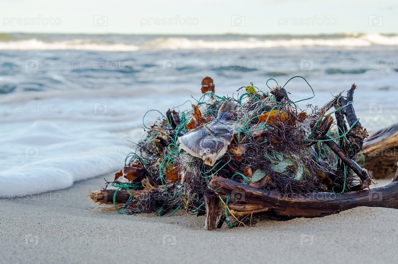 Рыболовные сети на берегу. Мертвая рыба в рыболовных сетях. Браконьеры в море
