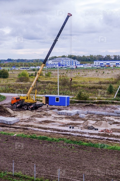 Строительство здания. Строительные и промышленные работы. Кран на территории стенда