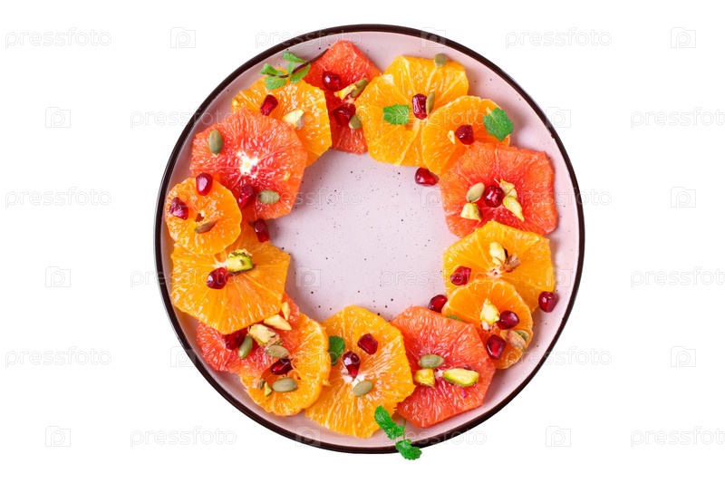 Цитрусовый фруктовый салат с кусочками апельсина, красного апельсина и мандарина на круглой керамической тарелке, изолированной на белом. Здоровая веганская еда