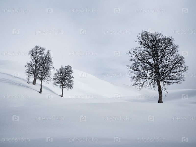 Черные деревья на фоне белого снега и неба. Минималистичный пейзаж