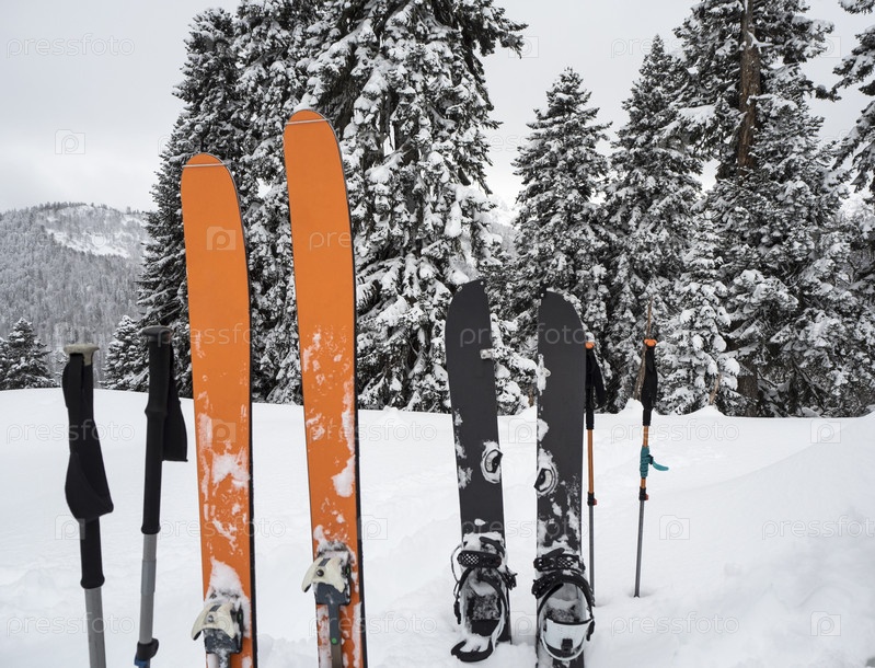 Горные лыжи, сплитборд и палки в снегу на фоне елового леса