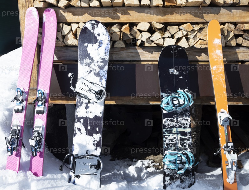 Набор горных лыж и сплитбордов, опирающихся на деревянную стену