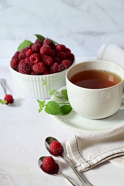 Спелая малина в белой тарелке на белом фоне, чай с малиной, витамины для организма