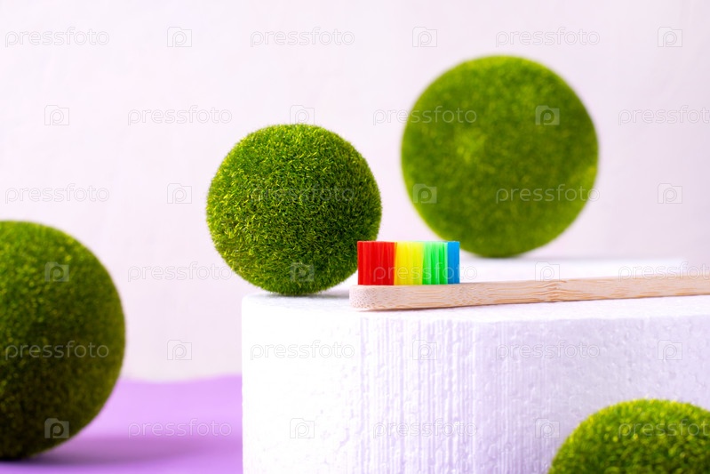 Деревянная зубная щетка с радужной щетиной и сферами зеленой травы на белом подиуме. Гигиенический инструмент из биоразлагаемых экологически чистых материалов