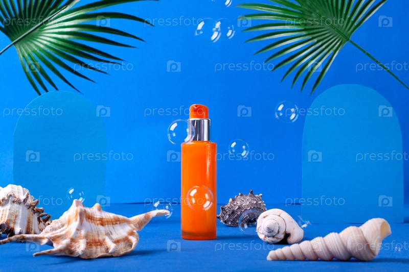 Косметический продукт с летающими пузырьками и ракушками на синем фоне. Очищающая пена, гель для душа или шампунь. Мокап с немаркированным средством по уходу за кожей