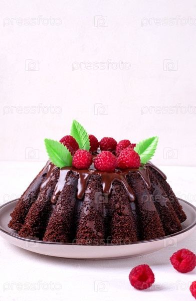 Шоколадный торт с рифлеными сторонами, покрытыми глазурью, малиной и зелеными вафельными листьями, подается на керамической тарелке на белом столе