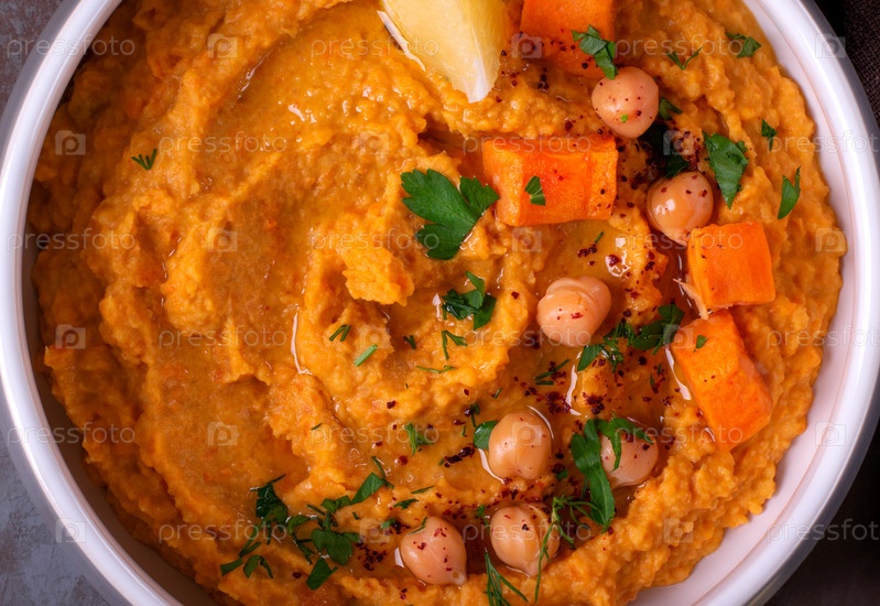 Хумус со сладким картофелем, нутом, тахини, чесноком и оливковым маслом, увенчанный ломтиком лимона, травами и сумахом. Блюдо ближневосточной кухни. Вид сверху. Полный кадр