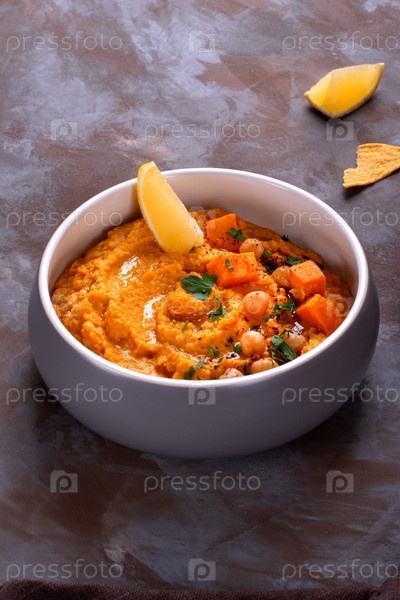 Хумус со сладким картофелем, нутом, тахини, чесноком и оливковым маслом, увенчанный ломтиком лимона, травами и сумахом. Блюдо ближневосточной кухни