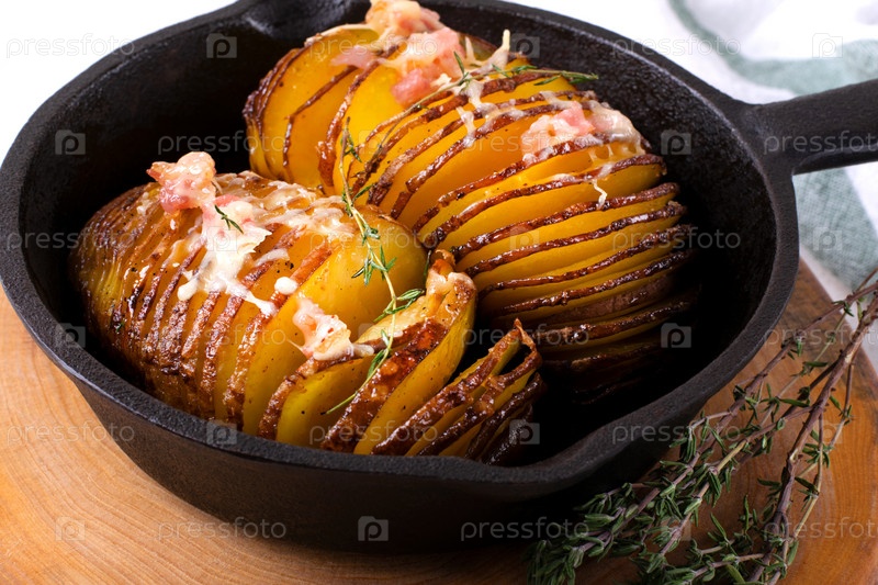Картофель Хассельбек, запеченный с сыром, беконом и ароматными травами, подается в чугунной сковороде. Горячая еда