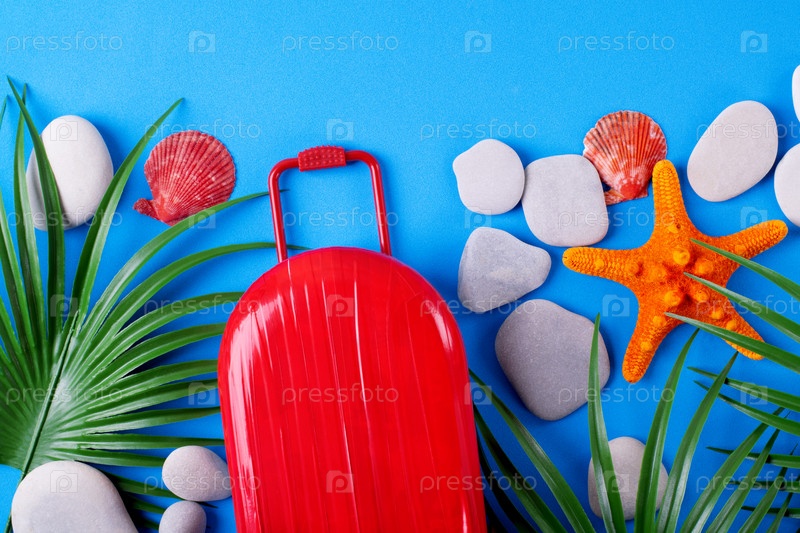 Плоская планировка для путешествий. Красный чемодан, камни, морская звезда, морская раковина и зеленые пальмовые листья на синем фоне. Концепция летних каникул