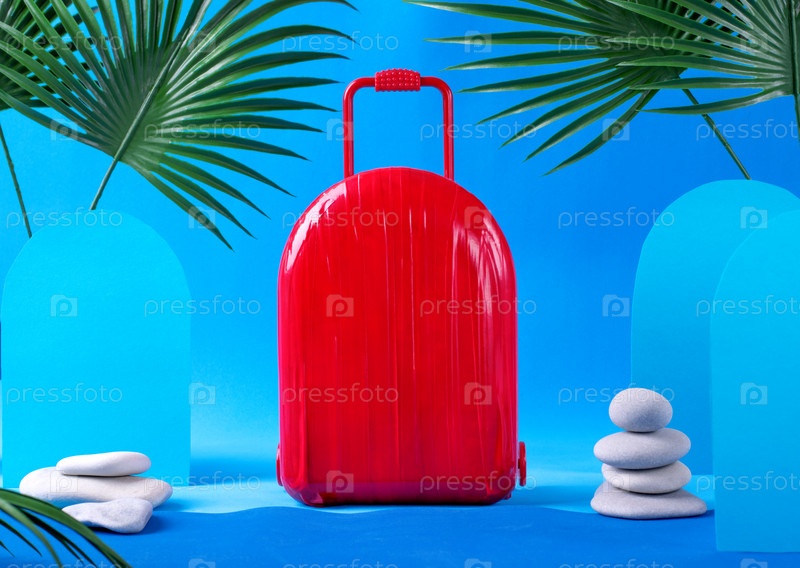 Красный чемодан на синем фоне с пальмовыми листьями и камнями. Концепция путешествий и летних каникул. Макет с местом для копирования на багаже