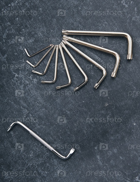 Набор ключей со звездочкой и двухсторонняя отвертка на сером фоне, вид сверху